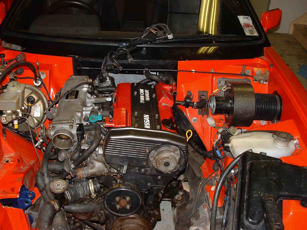 The Start The engine as lifted out of the 200sx will fit well into the engine bay and looks immediately as if it should be there. The mountings and clearances are all fine. The two hockey stick curved engine to gearbox braces need to be removed. This leaves two other brackets plus the block bolts to hold the engine to the gearbox so I am happy to simply omit these. The lower inlet manifold brace was also forgotten. For a straight replacement ET to DET then three points need to be addressed